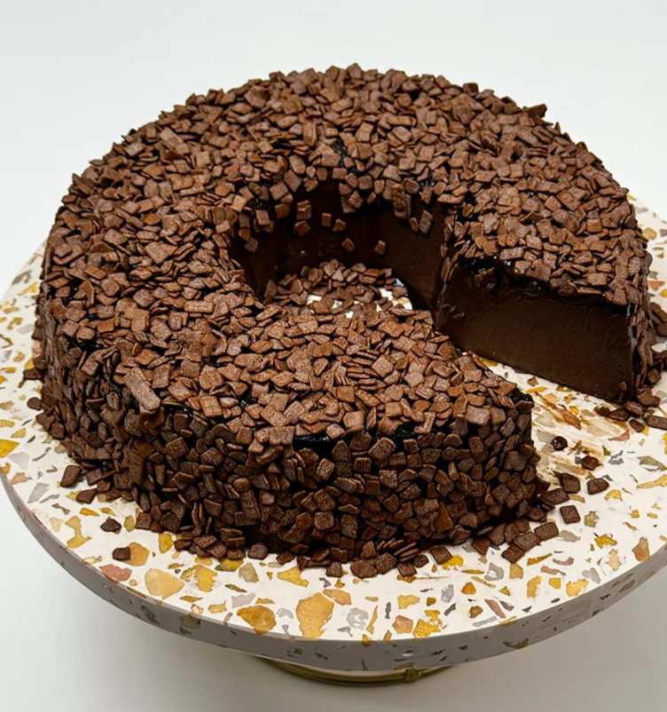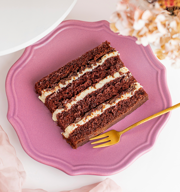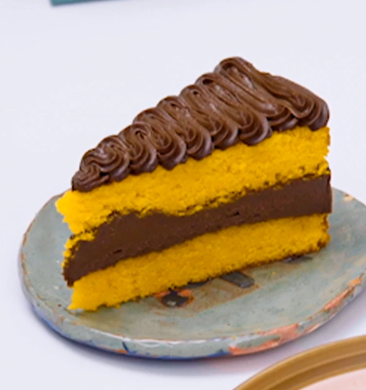 Recheado com cremeux de chocolate, massa fofinha de cenoura e um recheio incrível de chocolate, apresentado em formato de fatia triangular.