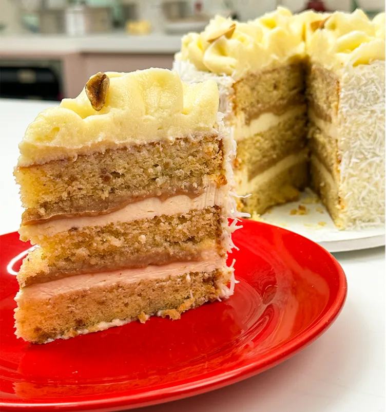 Massa genoise com paçoca, recheio de namelaka de coco e brigadeiro de paçoca.
